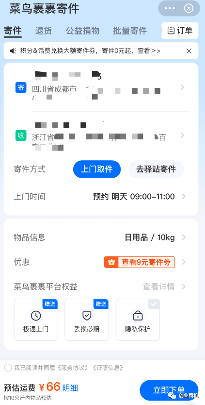 在菜鸟裹裹官方平台上,寄出这样一个快递需要66元。