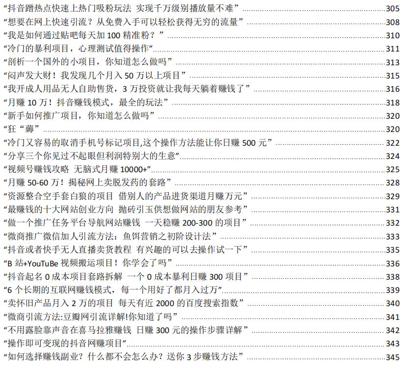 2023年最新450个搞钱玩法合集funniq2024年1月3日 18:10:14更新关注私信405 下载链接: 此处内容已隐藏,请付费后查看 推荐阅读: 朋友圈不刷屏文案心法课程 最新吃鸡必备和平透视脚本教程 淘宝高阶运营手册:千万级运营系统课,完整教你从选品开始做店技巧! 限时特价:开通永久会员只需29.9元,全站教程免费下载,每天持续更新 2023年最新450个搞钱玩法合集此内容为付费阅读,请付费后查看R币19.9 限时特惠R币38.9开通本站永久会员免费登录购买单个教程无需登录,可以直接购买;全站资源永久会员免费下载!付费阅读© 版权声明限时特价:开通永久会员只需29.9元,全站教程免费下载,每天持续更新 版权声明:本文内容由互联网用户自发分享,本站仅做收集整理。本站仅提供信息存储空间服务,不拥有所有权,不承担相关法律责任。如发现本站有涉嫌抄袭侵权/违法违规的内容, 请底部联系方式私聊举报,一经查实,本站将立刻删除。THE END推荐教程生活百科 限时福利 永久会员29.9元 支持自助开通收藏