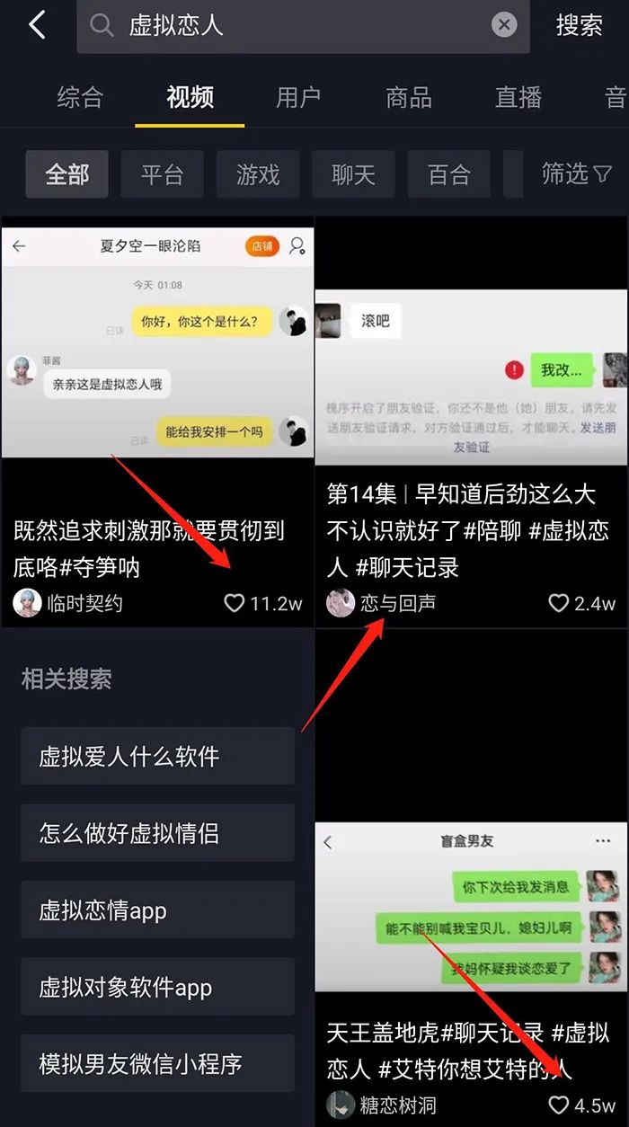 而这类账号对于剪辑的要求也比较低,截屏记录客户与“虚拟恋人”聊天的视频能轻松获得数万点赞和评论,可以看出这个项目还是非常好做的。
